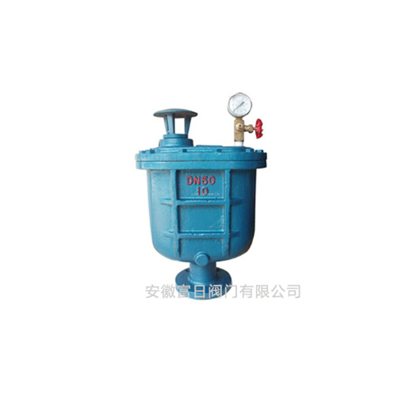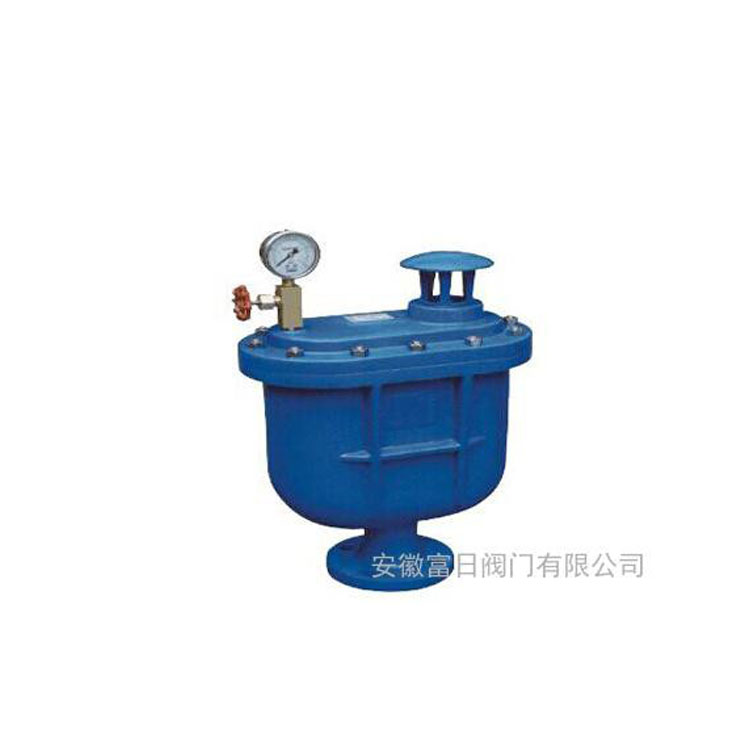 安徽富日阀门生产的复合式排气阀该阀结构为圆筒型,阀门内件包括不锈钢浮球、杠杆及阀瓣。本阀安装在泵出口处或送佩水管线中,用来排除集积在管中的空气,以提高管线及水泵的使用效率,当管内一旦产生负压时,此阀迅速吸入外界空气以防止管线因负压而损坏。